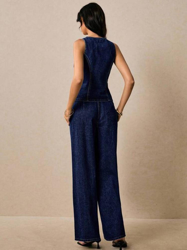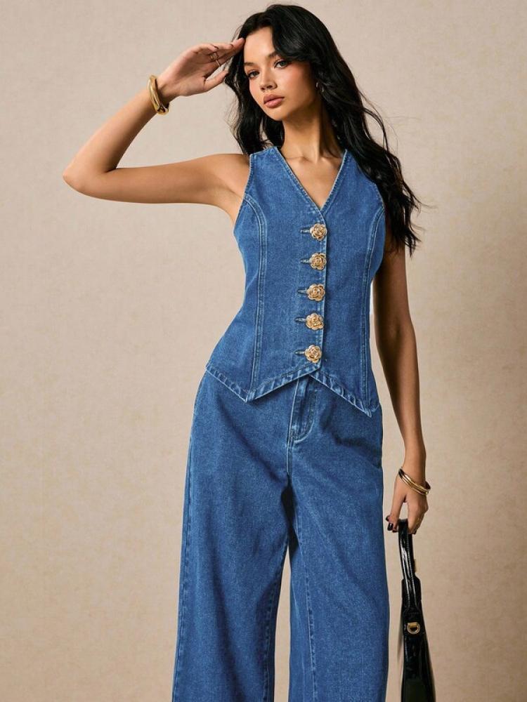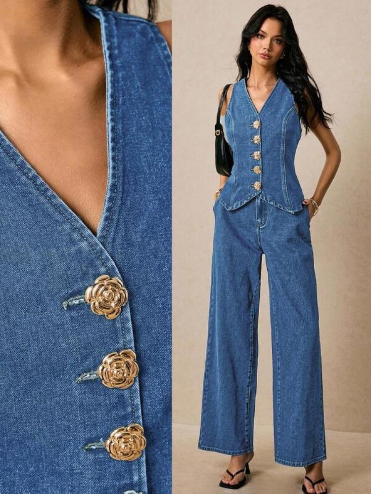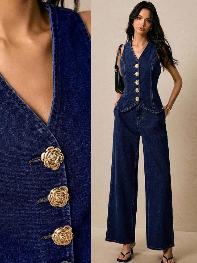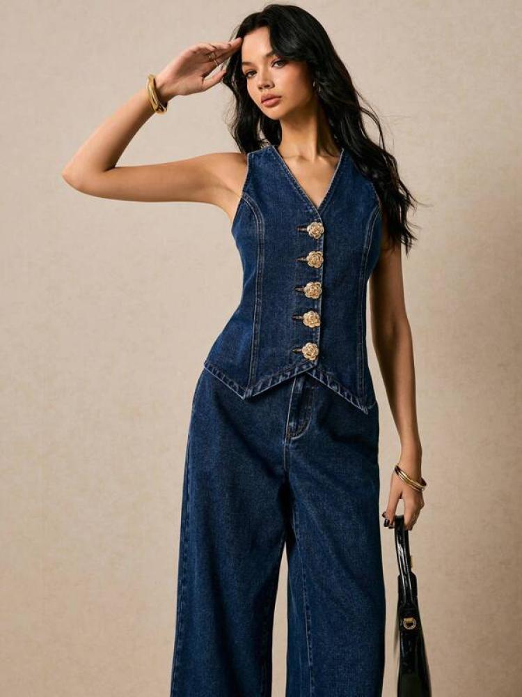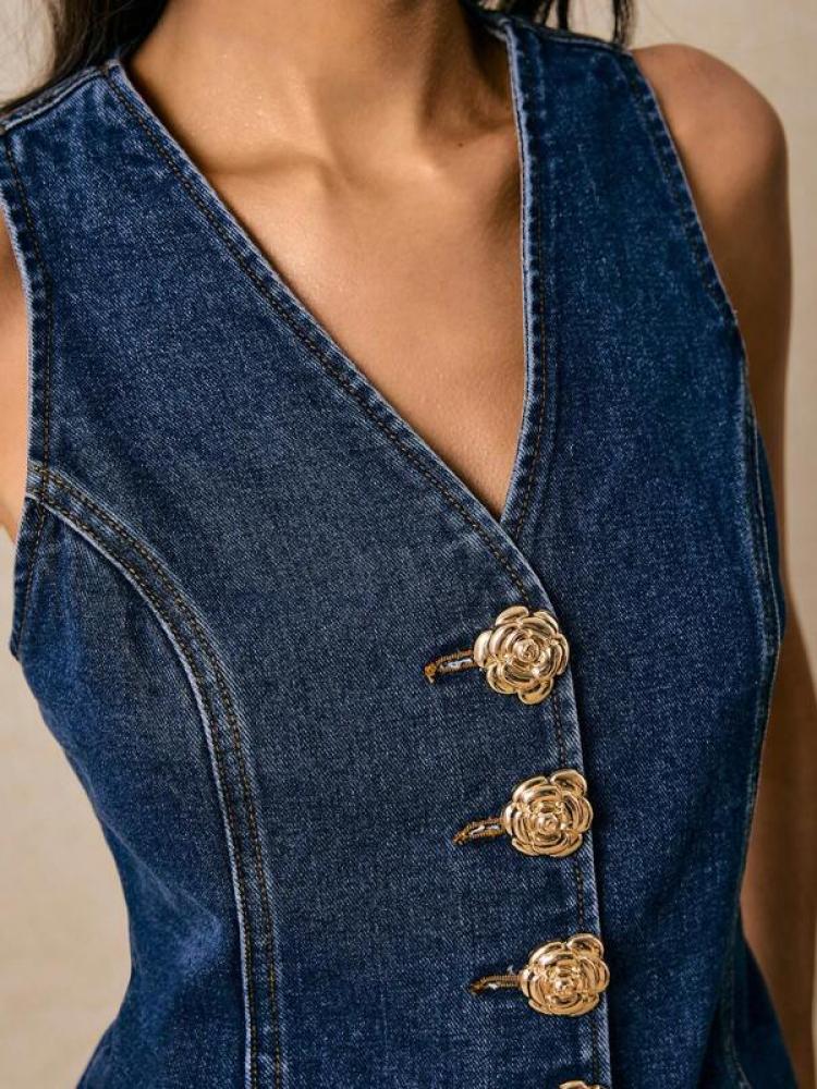 - • سديري دينم بياقة V مزود بأزرار معدنية على شكل زهرة